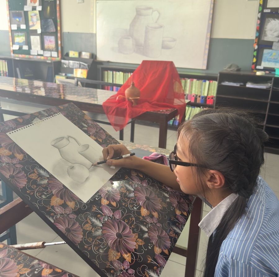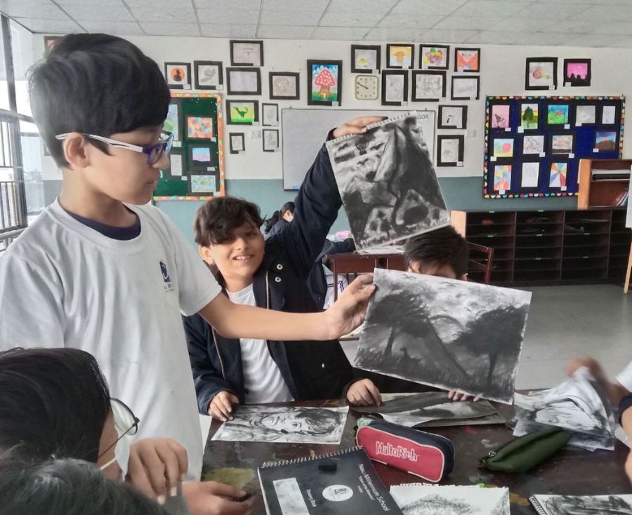 Grade VII students engage in charcoal drawing. The...